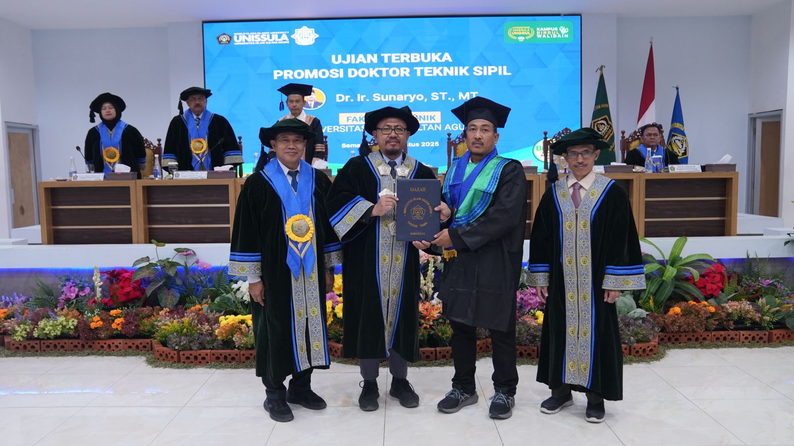 Ir Sunaryo ST MT mengikuti sidang terbuka promosi doktor di Program Doktor Teknik Sipil pada Jumat (29/8/2025) di Fakultas Teknik Sipil Unissula. Ia mempresentasikan disertasinya berjudul model tanggul fiber apung untuk antisipasi kenaikan air pasang.