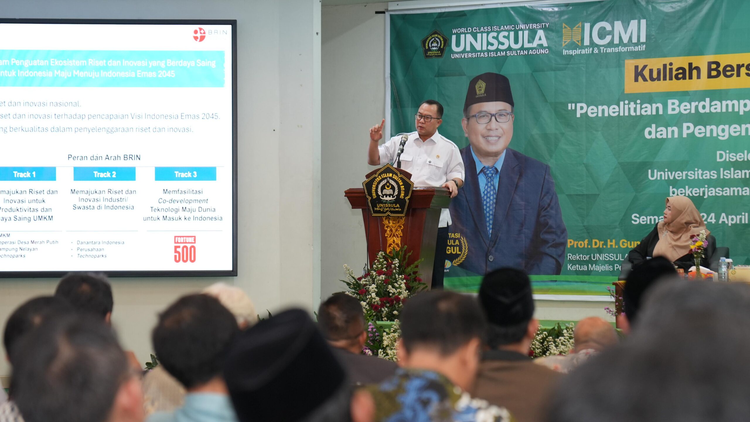Universitas Islam Sultan Agung (Unissula) akan mendapatkan dana untuk berkolaborasi riset bersama Badan Riset dan Inovasi Nasional (BRIN). Sehingga nantinya Unissula bisa menjadi pusat riset yang top di Jawa Tengah dan menjadi pilar bagi kemajuan bangsa Indonesia. Hal itu diungkap Kepala BRIN dan Ketua Umum Majelis Pengurus Pusat ICMI Prof Dr Arif Satria SP MSi dalam kuliah umum di Unissula, Jumat (24/4/2026).